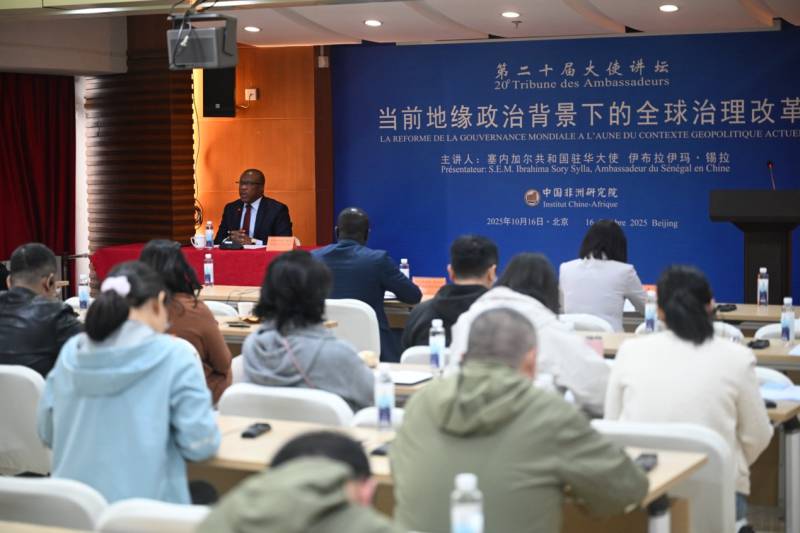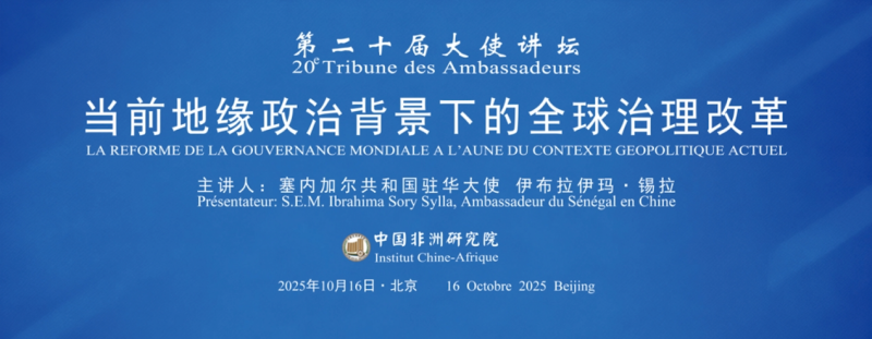 2025年10月16日,中国非洲研究院举行第二十届大使讲坛,邀请塞内加尔驻华大使伊布拉伊玛·锡拉(Ibrahima Sory Sylla)作题为“当前地缘政治背景下的全球治理改革”的主旨演讲。中国非洲研究院副院长田丰研究员主持讲坛,中国非洲研究院专家学者、中国社会科学院大学国际政治经济学院师生出席讲坛。