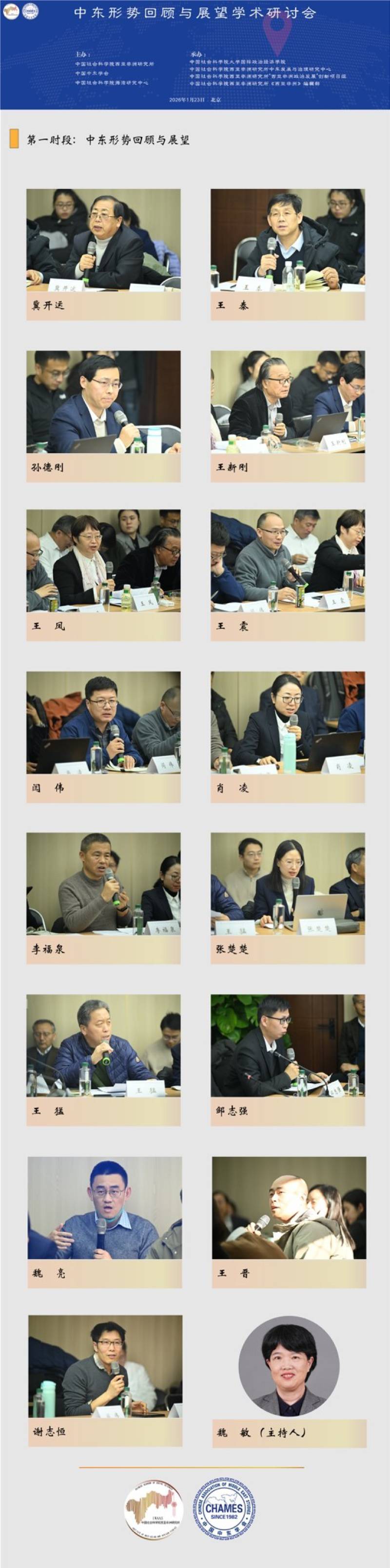 2026123日,中东形势回顾与展望学术研讨会在北京隆重举行。中国前中东问题特使吴思科,中国前驻以色列大使詹永新,中国社会科学院西亚非洲研究所党委书记周工岱,中国社会科学院西亚非洲研究所所长、中国非洲研究院院长叶海林以及来自全国各高校和研究机构的60余位专家出席了会议。中国中东学会会长、中国社会科学院海湾研究中心主任王林聪主持开幕式。