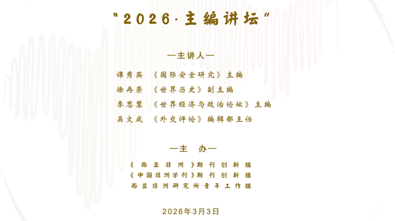“2026·主编讲坛”由中国社会科学院西亚非洲研究所(中国非洲研究院)《西亚非洲》期刊创新组、《中国非洲学刊》期刊创新组和青年工作组联合主办。