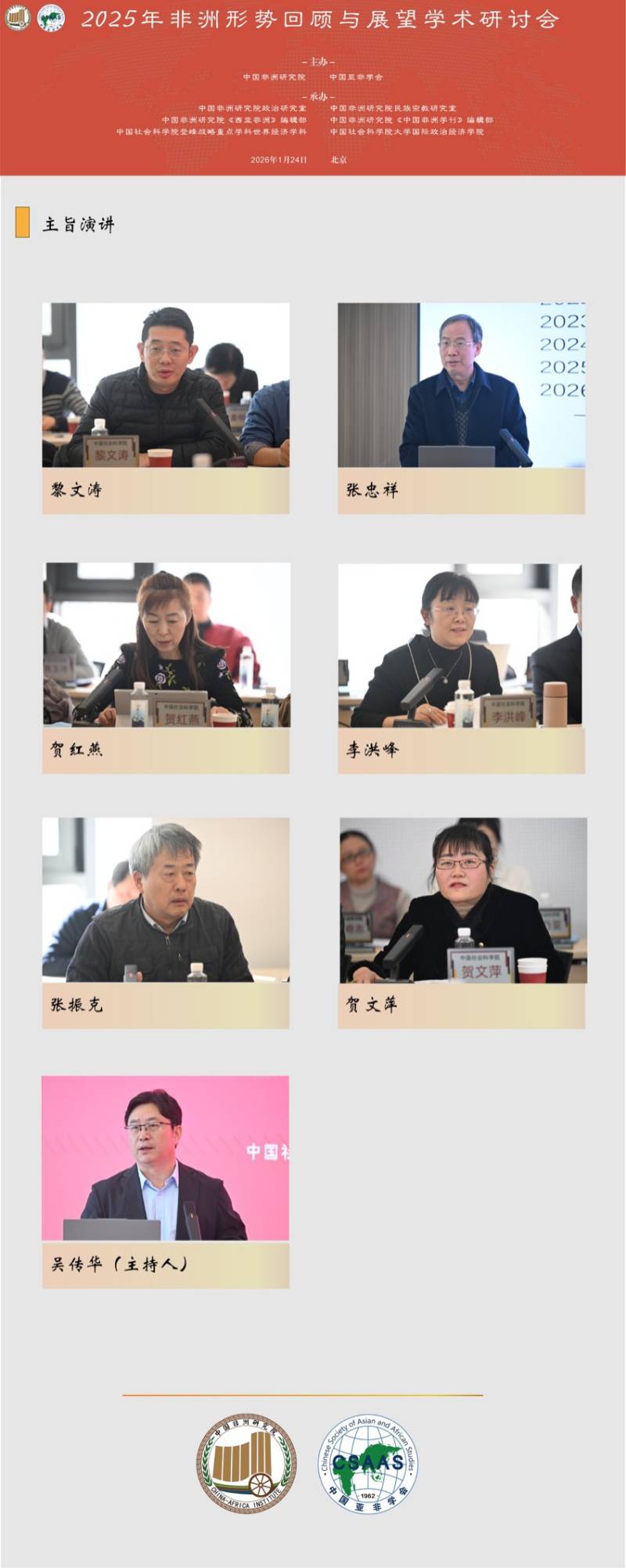 主旨演讲环节,中国现代国际关系研究院非洲研究所所长黎文涛对2025年非洲政治形势进行分析研判,指出当前非洲政治形势处于动荡变革期,西方在非洲的民主价值理念和政治体系遭受剧烈冲击,新生代深刻刻画非洲政治生态,非洲谋求独立自主,但在新旧秩序转换过程中,冲突与对抗可能是历史的常态。上海师范大学非洲研究中心主任、中国亚非学会副会长张忠祥教授对2025年非洲经济转型新态势与中非经贸合作新特点进行分析研判,指出非洲自20世纪起就开始从殖民地经济向民族经济的转型,至今尚未彻底完成。当前,非洲正持续推行包容性增长和经济多元化,绿色发展和数字经济成为非洲经济转型新趋势。非洲对关键矿产重视度不断提升,并持续推进经济一体化建设。中国亚非学会特邀嘉宾贺红燕对2025年非洲大湖地区政治形势进行分析研判,指出2025年大湖地区呈现和平协议与战事升级并存态势,刚果(金)东部冲突已演变成为大湖地区地缘政治核心,地区国家关系受历史、族群、资源等多重因素影响。北京外国语大学非洲学院院长、中国亚非学会副会长李洪峰教授对2025年法非关系进行分析研判,指出2025年是法非关系的分水岭,非洲“去法国化”进程实现突破性进展。“去法国化”并非单纯反法情绪,而是非洲后殖民时代结构性不平等、主权觉醒等因素共同作用的结果。面对影响力衰退,法国正被迫重塑对非战略。南京大学非洲研究所所长、中国非洲问题研究会会长、中国亚非学会副会长张振克教授从非洲蓝色经济浪潮兴起角度对非洲发展背后的角逐进行分析探讨,指出目前非洲蓝色经济概念正在被复杂化,等同于可持续发展,这可能对非洲发展产生负面影响。渔业合作等务实举措与蓝色经济发展理念或存在潜在矛盾,如何做好相关叙事至关重要。中国非洲研究院研究员贺文萍对非洲一体化进程以及围绕关键矿产争夺进行分析探讨,指出非洲继续朝着联合自强趋势发展,但是面临的内外挑战也严峻复杂;非洲关键矿产成为大国争夺焦点,尤其是美国“以安全换矿产”特征明显,给中非合作带来新的挑战。中国非洲研究院《中国非洲学刊》副主编、编辑部主任,中国亚非学会秘书长吴传华主持主旨演讲。